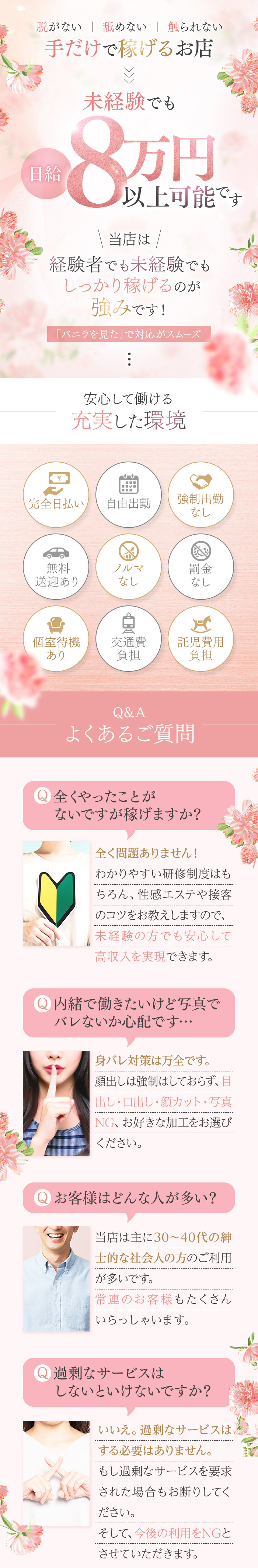 手を使うだけ・見ているだけ・または女の子が受け身にならなくてOKなソフトサービスメインのお店だよ♪初心者の女の子には始めやすいお仕事だね!コースによってサービスの違いがあるお店もあるみたいだから、お仕事内容は事前に聞いてみよう!
