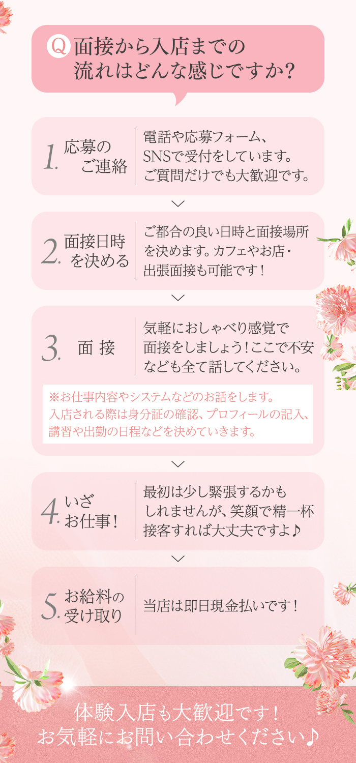 女の子のお仕事に対してノルマや罰金などがないお店だよ♪お店によっては、入店から◯ヶ月以降からはノルマが発生したり、無断欠勤などでは罰金になってしまうなどルールがあったりもするから、入店前にはしっかり聞いてみてね!