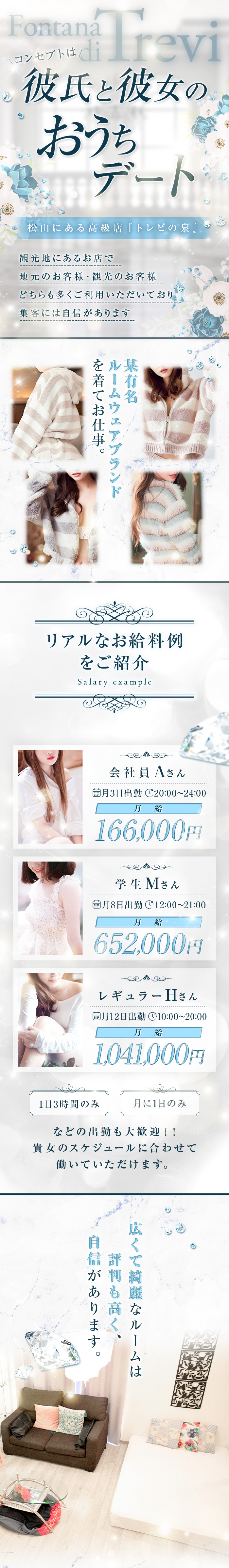 道後トレビの泉店です。 トレビの泉店は出勤ノルマありません。 キャストさんの体調に合わせて出勤を決めることができます。 よろしければご応募くださいませ。