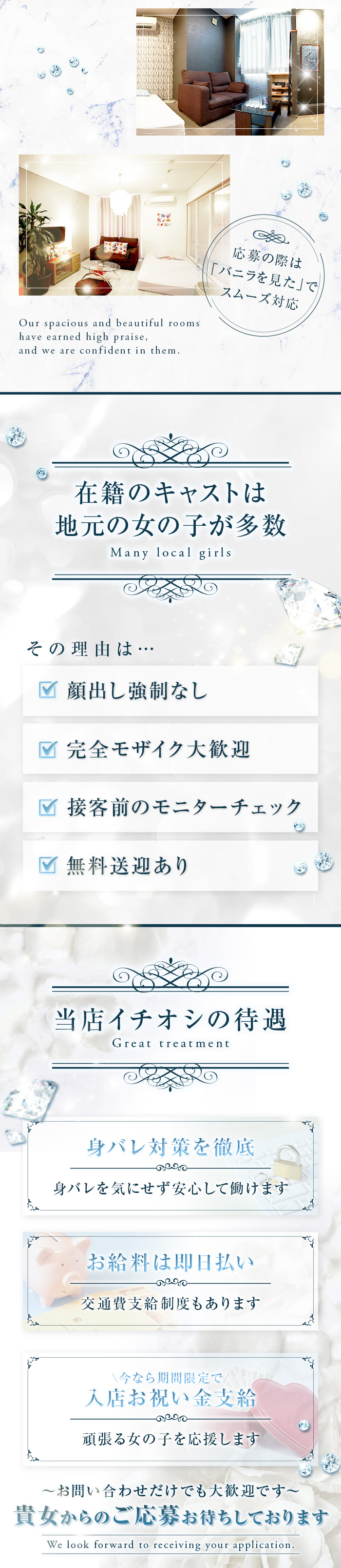 四国内の超大型グループで安心の稼ぎと待遇をご提供! あなたのプラス@の生活を最大限に応援致します! 勤務日 お好きな時間帯で完全自由出勤 アルバイト・短期でも大歓迎!! 風俗だから容姿端麗でなければ稼げない? そんなことはありません。 お客様でも1,000人いたら1,000通りの趣向や好みがあるように、 【お客様の求めるもの】は多種多様です。 当店では、女性らしい雰囲気や性格重視の採用基準になります。 容姿に自信のある方もそうでない方も、 個性がある方もそうでない方も、 「お客様があなたを必要とされています♪」 ぜひご一緒に当店でお仕事してみませんか?