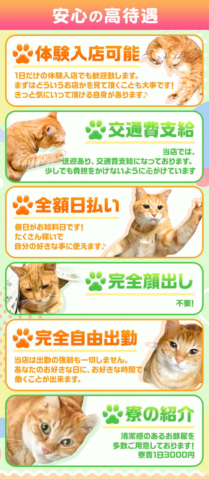 大手グループが経営しているお店だよ。待遇や条件も手厚くて安心だし、集客力もあって女の子が稼ぎやすい!待遇や条件はグループの中でも店舗ごとに変わってくるから、気になるポイントは問い合わせて聞いてみよう♪