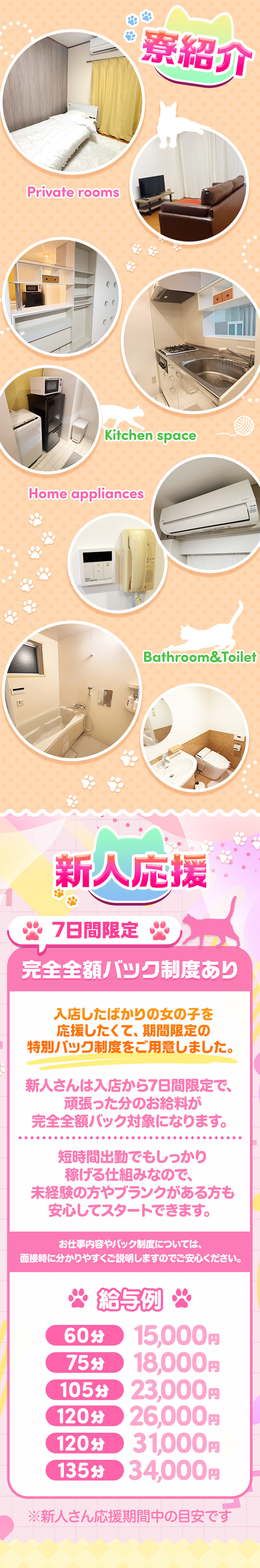 女の子のお仕事に対してノルマや罰金などがないお店だよ♪お店によっては、入店から◯ヶ月以降からはノルマが発生したり、無断欠勤などでは罰金になってしまうなどルールがあったりもするから、入店前にはしっかり聞いてみてね!