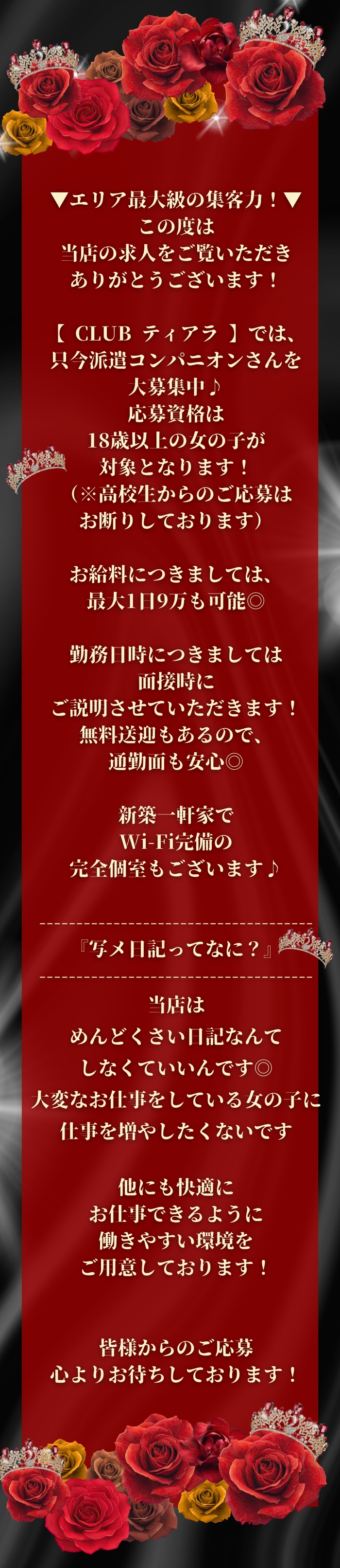 ・最大1日9万!? ・無料送迎有り ・Wi-Fi完備 ・めんどくさい写メ日記などの投稿なし! ・雑費、引き物一切なし! |