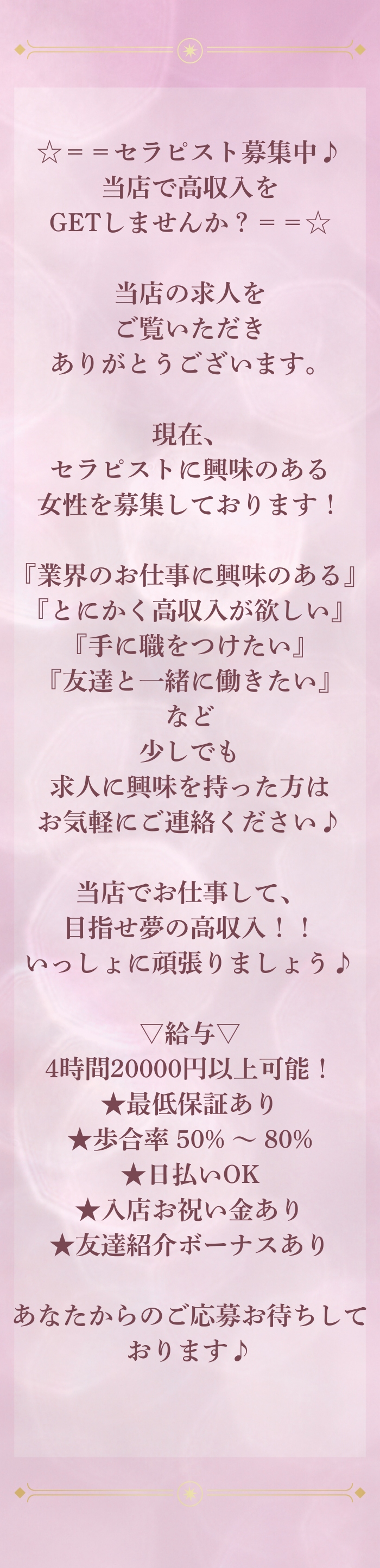日給目安 20,000円 ~ 50,000円 ★最低保証あり 4,000円 ~ ★歩合率 50% ~ 80% (研修期間一か月のみ50%) ★日払いOK ★入店お祝い金あり (30,000円) ★友達紹介ボーナスあり (30,000円)