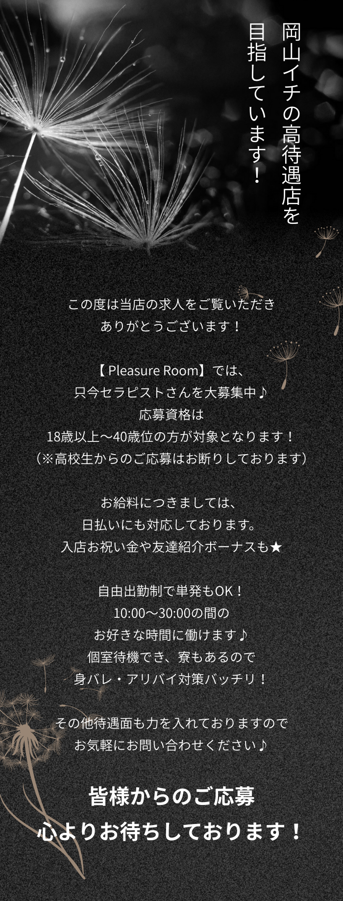 | 交 通 | 岡山市内の通いやすい人気エリアで、駅チカのワンルームマンション型ルームになります⭐︎ 詳しい場所は、応募後に担当スタッフが丁寧にご案内します!車通勤や電車通勤など、あなたのライフスタイルに合わせた通い方も相談OKです。送迎もあるので、夜遅い時間帯でも安心してお仕事できます♪ |