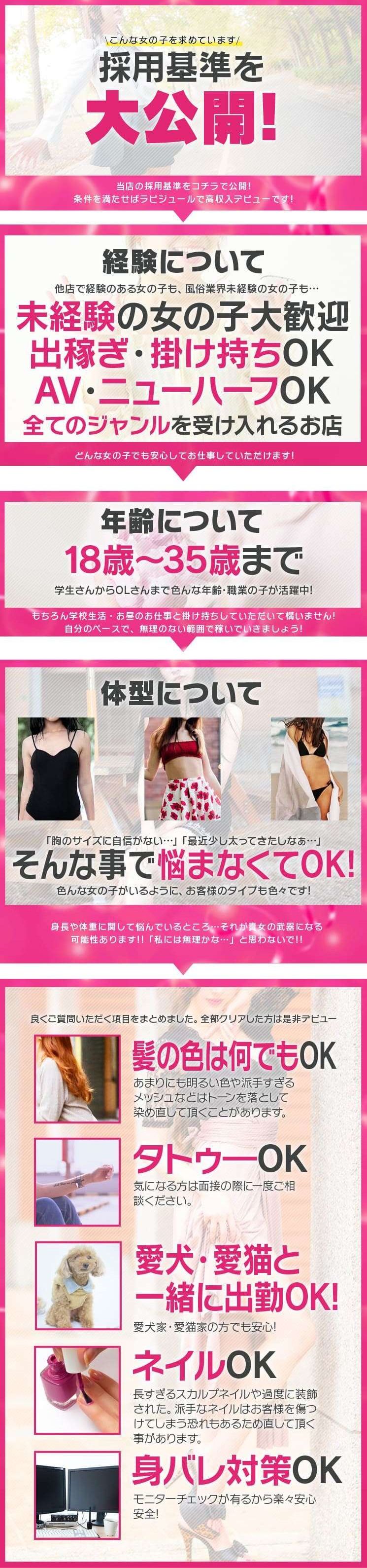 NO1よりOnlyoneのお店Ravijour~♡求人をご覧いただきありがとうございます!!1日 10万オーバーもちろん可能です!当店ラビは女の子第一です!体調面、メンタル面の不調の際は無理せずに休んでください😌出勤前に連絡を入れてもらえればありがたいです!休んだからといってペナルティなどはございませんのでご安心を(o^―^o)休みたい時は休んで働きたい時に働きましょう!!!えいえいおーーーーーーーーお気軽にお問合せ下さい!女の子にお客様に仕事に真面目に取り組みますキャストさん募集中当店ラビは「完全自由出勤」になります!!それぞれのライフスタイルに合ったお仕事の仕方をご提案いたします!シフトの縛りなどはございませんので、空いた時間で気軽に稼いでいただけます!当日の緊急出勤や短時間からのご出勤も対応しております!!貴方にお会いできるのを楽しみにしておりますお気軽にお問合せ下さい圧倒的に認知度の高いお店ですので平日・週末・時節に関係なく短時間でも安定した高収入が得られますまた、完全個室待機により、親バレ・彼バレの不安や心配はありません!対策万全の設備とスタッフが貴女をサポートします12月お部屋の空きございます。