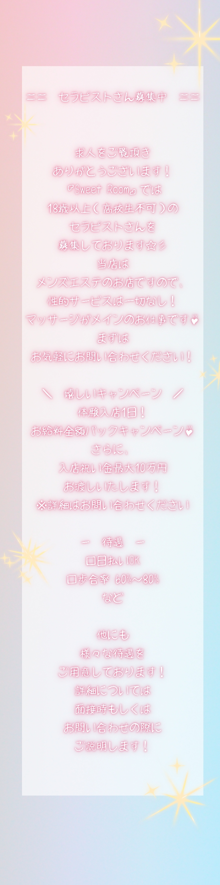 ★日払いOK ★入店お祝い金あり(100,000円) 歩合50〜70%、OP・指名フルバックで高収入⭐︎完全日払い・日給保証あり、完全自由シフト、完全個室待機、罰金・ノルマ・雑費なし!衣装無料レンタル、無料講習、送迎あり、面接交通費支給、オンライン面接(LINE)対応になります! |