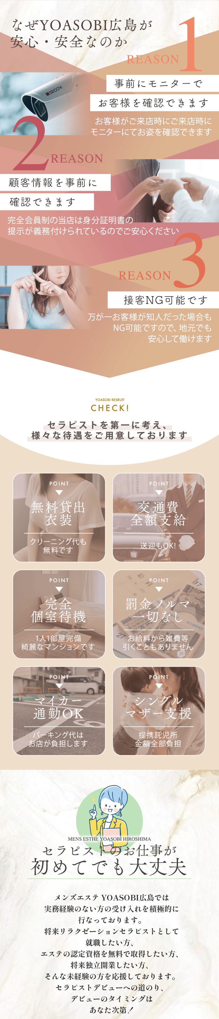 顧客管理、しっかりしています!「変なお客様だったらどうしよう…」これ、みんな最初に思います。当店は、顧客管理をしっかり行っているお店です。・過去にトラブルがあった方・ルールを守らない方・女の子が不安を感じた方そういったお客様は、ちゃんと情報を共有・管理しています。「誰でも入れるお店」ではありません。女の子が安心して働けるように、お店側が守るのは当たり前だと思っています。少しでも不安があれば、すぐスタッフに言ってOK。無理に我慢させることはありません。当店は、安心して働ける場所をつくるための顧客管理を徹底しています。未経験の子も、移籍の子も、安心して来てください。