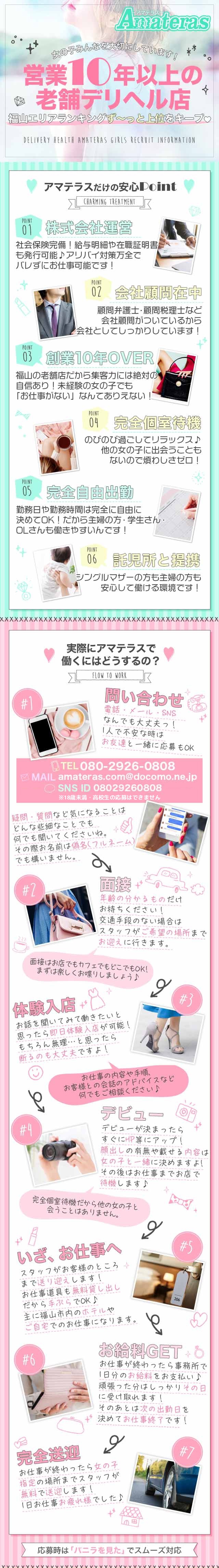 色んな風俗店を何回も利用していると、7割くらいがハズレです。このハズレには、・容姿 ・接客内容 ・女性の性格と大きく分けて3つのハズレがあります。例えば、容姿のハズレで言えば、ほとんどの風俗店では、写真加工を強めにしています。つまり、写真と全然違う女性が来るなんて事は当たり前です。アマテラスは、信頼出来るお店と言われています。それは、写真加工をやり過ぎないからです。バレ対策の都合上、写真加工をしないという選択は出来ませんので、しっかりと修正はしていますが、本人の雰囲気を最大限に活かす修正方法で行っています。「写真とぜんぜん違うじゃねーか!」という事にほとんどなりません。もちろん在籍写真から、身バレする心配もありません。(それでも心配な子は、写真自体をNGにする事が出来ますので安心してくださいね(^^))色んな風俗店を利用していると、ここは信用出来る or 出来ないとう事が分かってきます。信用されるお店は何が違うのか?ということですが、当店は写真だけじゃなくお客様のご利用履歴を管理しており、お客様のタイプ年齢や容姿を把握しご案内しているからです(*^_^*)お客様から信頼されているお店ですので、フリーでも大丈夫!と思われているから沢山のお客様へ接客する事が可能です。お客様に貴女を見て頂けるチャンスが多いということです!アマテラスがオープンして、集客数・売上がずっと安定して成長しています。ずっと信頼されているお店です。もちろんこれからもそうあるように努めていきます(^^)集客が安定しているお店には、ちゃんと理由があるんです。