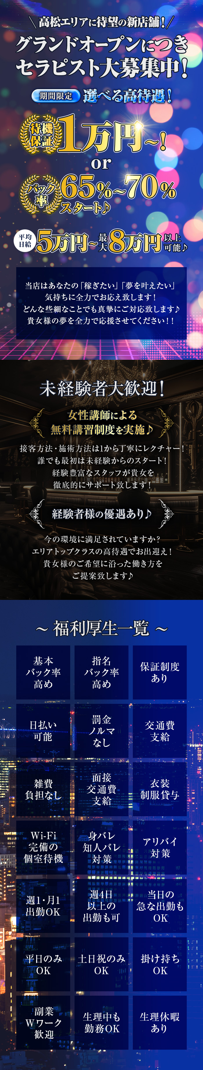 【期間限定】 [選べる高待遇!] 【待機保証1万円~!orバック率65%~70%スタート♪】 【平均日給5万円~最大8万円以上可能♪】高松エリアに待望の新店舗!《グランドオープンにつきセラピスト大募集中!【期間限定】[選べる高待遇!]【待機保証1万円~!orバック率65%~70%スタート♪】【平均日給5万円~最大8万円以上可能♪】当店はあなたの「稼ぎたい」「夢を叶えたい」気持ちに全力でお応え致します!どんな些細なことでも真摯にご対応致します♪貴女様の夢を全力で応援させてください!!《未経験者大歓迎!》【女性講師による無料講習制度を実施♪】接客方法・施術方法は1から丁寧にレクチャー!誰でも最初は未経験からのスタート!経験豊富なスタッフが貴女を徹底的にサポート致します![経験者様の優遇あり♪]今の環境に満足されていますか?エリアトップクラスの高待遇でお出迎え!貴女様のご希望に沿った働き方をご提案致します♪