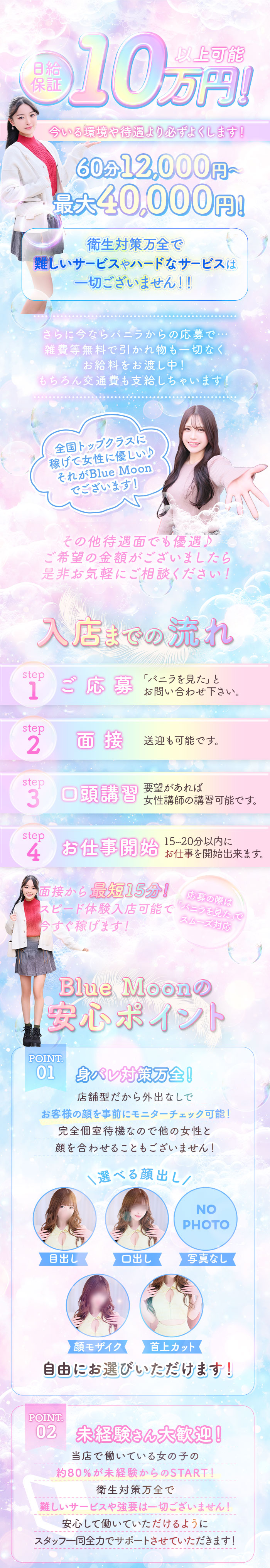 未経験の女の子も大歓迎です♪ お仕事の流れはスタッフが丁寧にお教えしますし、当店の場合は女性の運営スタッフもおりますので男性スタッフに聞きにくい事は女性スタッフまでご質問ください! ちなみに体験入店も出来るので1度だけ体験入店をしてみてそこから続けていくかどうかの判断をして頂いても大丈夫です♪