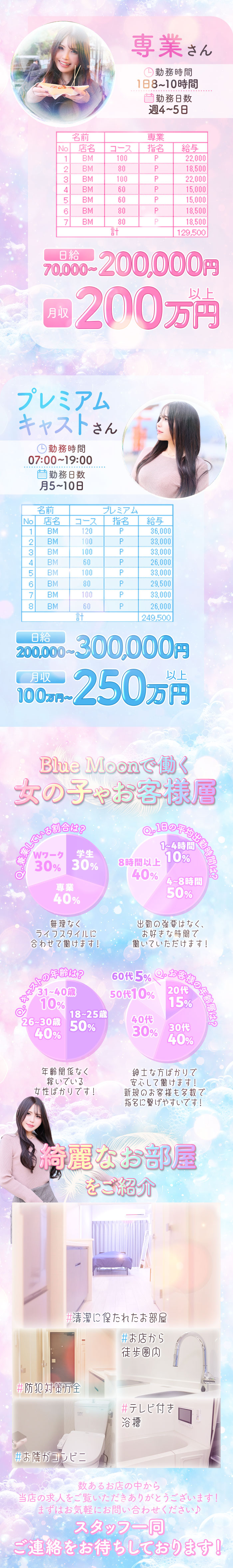 こんばんは!ブルームーンです💙「どうすれば稼げるのか分からない…」「私にもできるのかな…?」そんな不安、きっと誰もが一度は感じたことがあるはず。でも実は、稼げている女の子たちに共通しているのは、特別な才能や見た目ではなく、ちょっとした“習慣”なんです!💡今日からできる!稼げる子の3つの共通点✅ 1.笑顔で挨拶ができる子第一印象はとにかく大事!「こんにちは😊」と明るく声をかけるだけで、お客様との距離がグッと縮まります。✅ 2.勤怠や報連相がしっかりできる子出勤予定をちゃんと伝える、遅れそうな時はすぐ連絡する。たったそれだけでスタッフからの信頼が高まり、チャンスがどんどん増えます!✅ 3.自分の“ウケポイント”を理解している子「私ってどういうタイプにウケるんだろう?」少し意識するだけで、接客に自信がつき、指名にもつながりやすくなります✨🔰「変わりたい」と思った今がチャンス!どれも今日から始められることばかり。「何か変えたいな」そう思った瞬間が、スタートのタイミングです😊これからの季節、一緒に“稼げる私”を目指しませんか?どんな小さなことでも、スタッフがしっかりサポートしますのでご安心ください🌸相談だけでも大丈夫なので「れなちゃんブログを見た」でご気軽にお問い合わせ・ご応募お待ちしてます(^^♪💗