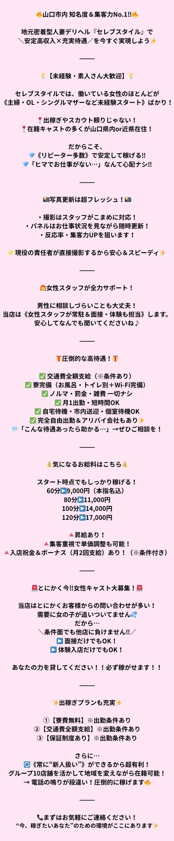 🚨いま電話が鳴り止まらないっっ!!!だけど……女の子の数が足りなーーーい!!!😭💦だからこそ!!🌟🌟🌟新しい仲間を大・大・大募集しますッ!!!🌟🌟🌟⸻💎特に大チャンスなのは…💎🌅朝から働ける女の子!!🌞お昼の時間に出勤できる地元っ子!!この時間帯はお客様が多くて予約も即完売ッ!!🎯いま入店すればライバル少なめでめちゃくちゃ稼げます!!⸻💖セレブスタイルの魅力ポイント💖👑その1:交通費支給バッチリ!🚗山口市内は送迎あり!🚃電車・バス通勤なら半額支給!⛽車通勤はガソリン代支給!👉どんな通勤スタイルでも安心&お得ッ!!⸻👑その2:完全個室待機!「他の子と一緒は気まずい…」そんな不安もナシ!🏠完全個室寮で、プライベートも守られます♪スキマ時間でサクッと稼げるのも最高ッ!!⸻👑その3:完全自由シフト制!📅好きな日に!🕐好きな時間だけ!無理な出勤は一切なしッ!!!プライベート優先派も大歓迎です♪⸻👑その4:身バレ対策バッチリ!🕵♀「知り合いにバレたらどうしよう…」も心配無用!❌NG登録で知人からの予約は自動ブロック!!安心して働けます🔥⸻🌈未経験でも安心!体験入店OK!「初めてだから不安…」そんな方も大丈夫!分からないことはスタッフが全力サポート!💥体験から始めて、自分に合うか試してみてください♪⸻✨一歩踏み出せば、人生が変わる!!✨進化し続けるセレブスタイルで、あなたらしく輝きませんか?💎今なら特典&キャンペーンも盛りだくさん!!🎁📱LINEでも💌メールでも📞電話でもOK!あなたからのご連絡をスタッフ一同お待ちしてますッ!!💃🔥Let’sGo!!セレブスタイル!!🔥