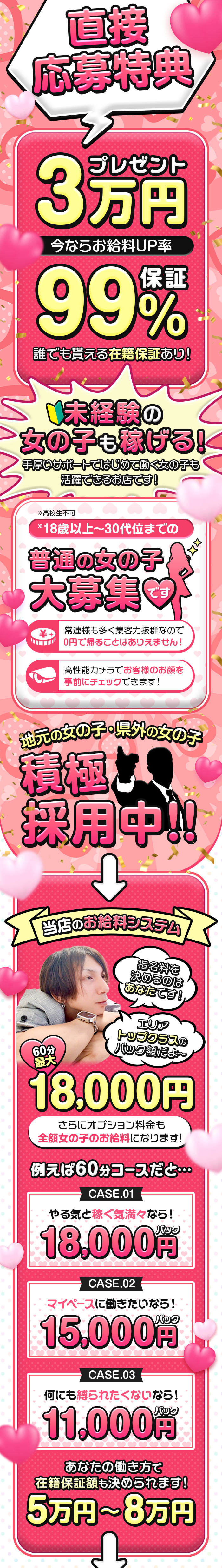 ◆稼いでいただいた分はその日のうちに全てお持ち帰り頂けます◆最新のモニターを完備しております◆仕事は難しくありません。◆色々、ご相談ください◆お客様の層が抜群にいいので、とても働きやすいです。◆セクハラ講習等、一切ありません。◆これらの事から、当店では在籍の女の子が長く働いてくれておりますし、卒業や退店の女の子が再び復帰してくださる例も多くあります本当に有難く思っております |