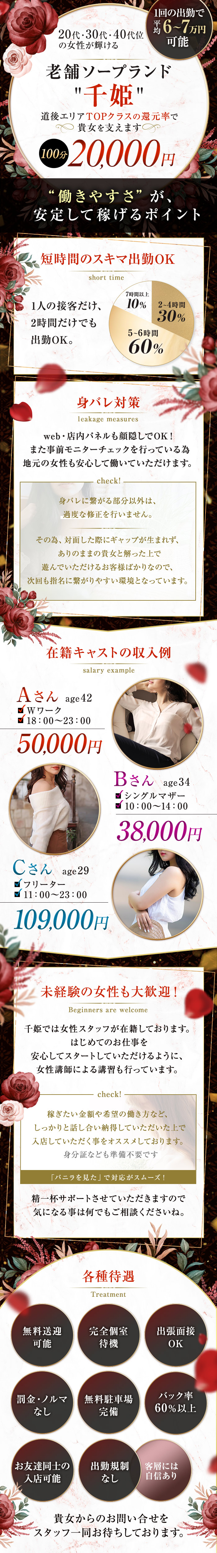 | 勤務時間 | 10:00~24:00のご都合のよい時間で、貴女の希望を優先します★ |
