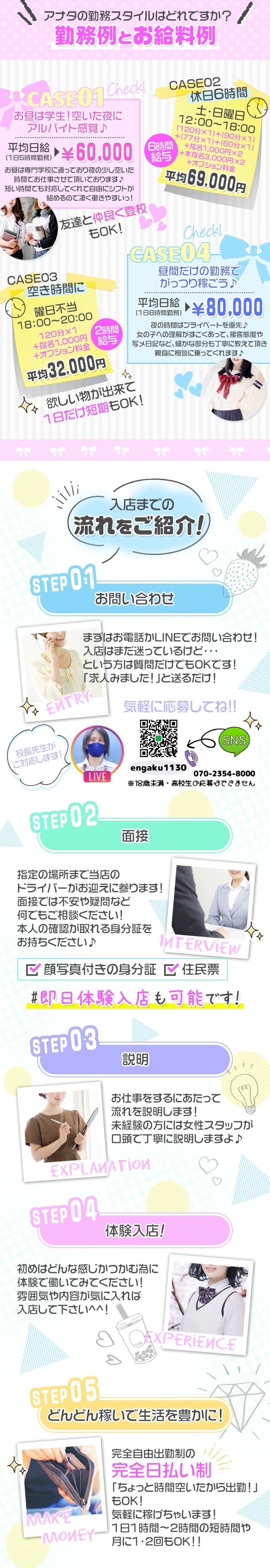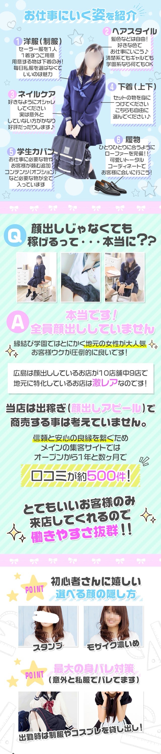 縁結び学園では自分で選べて 働きやすいコースを5種ご用意!0【おしゃべりコース】エロイ事、おさわり一切無しのコース楽しくお喋りするのが目的です♪みんな優しい方ばかり!1【メンエスコース】未経験の方や男性経験が少ない方メンエスからデリヘルに興味を持ちはじめた方向けの安心のコース(てこきプレイ)で接客できます。こちらは粘膜接触がないプレイとなります。※お客様とキス無し!2【受験コース】 主にこちらから縁結び学園をお試しで働いてもらえるコースです♪その名前通りこれから成長してもらう事も含めてゆっくり頑張っていく地元の方向けなコースとなります。3【進学・良縁コース】 経験者や移籍をしてきた方はこちらからのコースとなります!出世コースと言っていいかもしれません実績を上げれば上げる分だけお給料が上がります!!すごく頑張りたい。という方や、とりあえずまったりでもお客様をリピートするよ。というスタンダードなコースです(良縁コースは一段階上のコースとなります)4【1stClassコース】 まさに名前の通りのVIPそうなコース。お客様が問い合わせをして、即完売!予約が取れない!というプレミアムなコース!こちらはお客様支持率やキャストの女性の頑張りをみてランクアップします!お給料も…とんでもないくらい高いので!是非本指名の数や頑張りたい!という方は狙ってみてくださいね♪校長先生も仕事人なので出てきてくれたら、とっても嬉しいです!(笑)お話したいですw---お給料について---おしゃべりコース 60分 平均5000円 スタートメンエスコース 60分 平均9000円 スタート進学コース 60分 平均11000円 スタート良縁コース 60分 平均15000円スタート1stClassコース 60分 平均22000円 スタート-------------------✙顔出しNG、初心者さんでも簡単に稼げる完全マニュアルをご用意!✙お仕事道具についても すべて支給 雑費無し✙オプション有料についてはフルバック✙Wi-Fi完備 ドリンク飲み放題 ネカフェをイメージしてください♪+運がいいと校長先生の手料理が食べれます+生徒に関しましては制服を貸し出し!私物を触られる事はありません+教師に関しましてはS.M.Lの私服をご用意50着程あります。当日の気分に合わせて着こなしてください✙オプション有料についてはフルバック✙出勤時に交通費が発生する場合はお店が負担させていただきます!✙お仕事道具についても すべて支給 雑費無し✙ヘアスタイル ネイルも自由♪とんがりコーンみたいな爪は要検討(笑)中国地方で でおそらく一番高く高待遇かと思います♪サポート面もお任せください!ここには書ききれていないので詳しくは…お問い合わせください!※1.2.3.4の金額は グランドオープン記念なので4月までの応募に限りとなります。【正確には3/10ごろまで】と、こんな感じです、、もっと伝えたいことは山盛りにありますが。この辺にしておきます自分の人生はメインは自分の為にあります!コンセプトが合わない..自分に自信がない..目標やお金が欲しい..でも少しでも変わりたい。今より良くしたい・・その動機だけで十分よいです!とっても、えらいです迷っている暇はないはずです。稼げるチャンスがあるのに動かないという事は「何も変わらずに歳だけとるだけ」と考えましょう今を楽しみたいなら動きましょう!そして是非!!縁結び学園で一緒に頑張りたいです(程よくでも◎)わがまま言ってください!全力でお供します(笑)是非!気になってくれたという方は お問い合わせ宜しくお願い致します!ぷち他のエリアを紹介します地元で働けない方は (広島エリア) がオススメ!オープンして二年目突入したてのお店で楽しくやりながら稼げちゃう!!㊗️クチコミ1111件超えました🎉毎日 日替わり校長飯を楽しみながら稼いだり!普通にバイトらしく稼ぎまくったりストレスフリーを目指しながら(多分達成済みたのしい 第二の学園生活を一緒に送りましょう♪お悩み相談は3秒以内に解決案を出せる程のポジティブマンが居ます←全部校長先生🧑🏫わら↓↓少しでも気になったり、今日のご飯の献立に迷っただけでも連絡してねwメニュー表か飯テロを送りつけます。笑笑地元で働けない方は (島根エリア) オススメ島根・鳥取は神様の町と言われていて縁結びの聖地 出雲大社があります♪----------実は縁結び学園 発祥の地は島根です縁結びと学園系を合わせました!出稼ぎを雇わずに6年が経ちました。とっても客層がいいので安心して皆働いています♪----------山口の湯田温泉にも縁結びにゆかりがある場所があると聞きました!とても楽しみでもあります♪これから お店をお願いしまーす🐤わら↓↓↓少しだけ 縁結び学園の特典や完備されているものをご紹介いたします🟡撮影ブース完備(いつでも写真撮影OK)🟡お化粧直しブース完備(自由に使用OK)🟡制服の支給(セーラー服,半袖など豊富)🟡手づくりご飯の支給(持ち帰りOK)🟡個室待機可能(希望通りで集団待機は任意)🟡小さな移動も送り迎えあり(すべて車移動)🟡顔出し自由なお店🟡お釣りの準