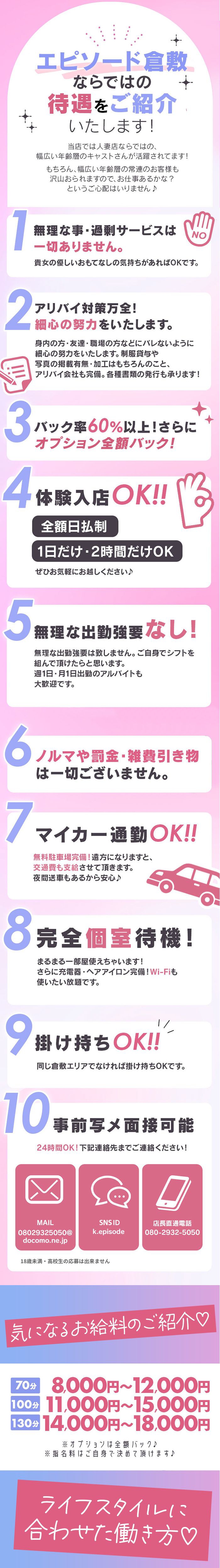 当店は倉敷に拠点を置くデリバリーヘルスとなっています。駅周辺でのお仕事が続くため移動時間が少なく、回転率が良いのが当店の魅力の一つとなっております。厳選されたスタッフですので落ち着いており、安心してお仕事に行ける環境は整っております。お給料も雑費など引かれ物はございませんので稼いだ額全てそのままお持ち帰りくださいね!!