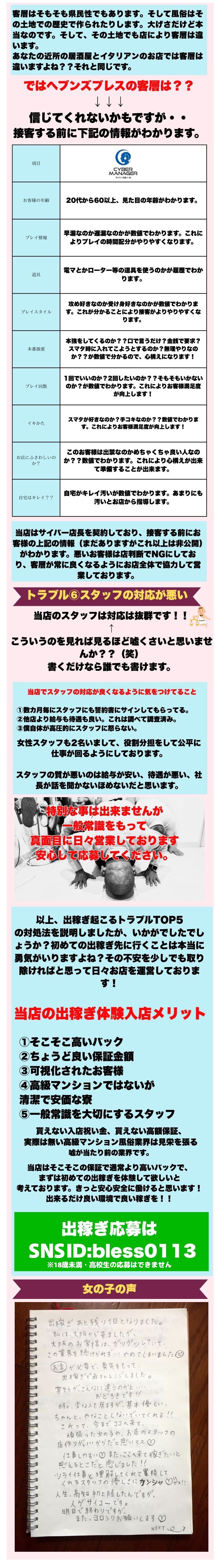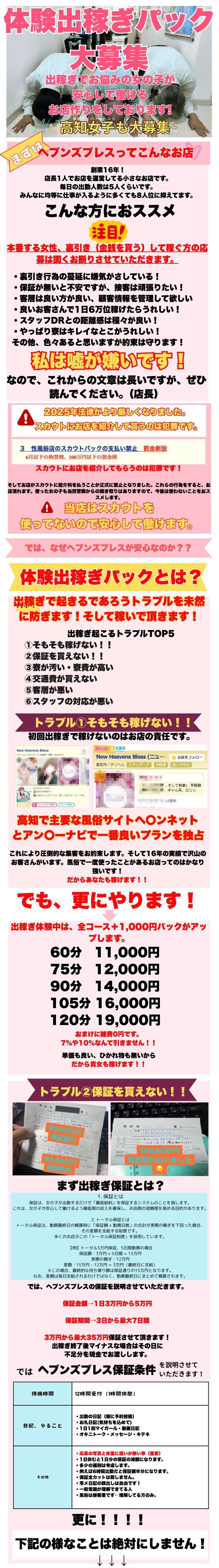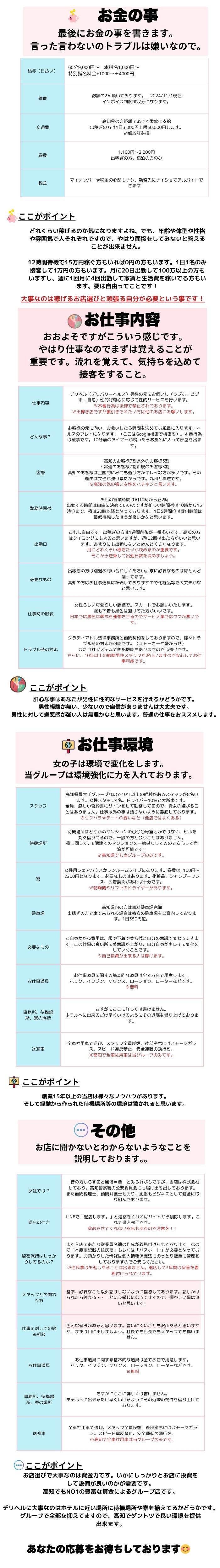 📩 ご応募を検討されている方へご興味を持っていただきありがとうございます😊当店では、お互いのミスマッチを防ぐために、まず下記の【応募フォーム】にご記入いただいております。以下の項目をできるだけ詳しくご記入の上、【必要な写真】と一緒にご送信くださいませ📷✨✍️ 応募フォーム■なぜ当店に応募を決めたのか?(詳しく)■出稼ぎ期間 :◯月◯日から◯月◯日の◯日間■お住まい:◯県◯◯市(ざっくりでOK)■年齢:■身長:■体重:■ブラカップ:■風俗経験:有・無■在籍店、源氏名とURL:■ 1日どれくらい稼ぎたいか?(例:2〜3万くらい)■志望の動機:■出稼ぎ経験:有・無■刺青・傷等:有・無(※ある場合は写メをお願いします)■煙草:吸う・吸わない■性格の特徴(人見知り、明るい、おとなしい等):■自己アピール:■エステ希望の方は経験年数・得意なマッサージを:■その他質問:📷 写真についての注意事項以下のルールを守ってご提出ください。 ❌アプリでの加工写真はNGです(B612 / ULIKE / SNOW等) ✅下着姿の全身写真(パターンを変えて2枚以上) ✅顔の正面写真(パターンを変えて2枚以上) ❌ 上からの角度や斜め撮り、過去のパネル・写メ日記の使い回しはご遠慮ください ✅ 必ず「面接用」に新たに撮影した自撮り写真をお願いします ご不明な点があればお気軽にお尋ねください🌸 皆様のご応募、心よりお待ちしております! お店選びで大事なのは資金力です。いかにしっかりとお店に 投資をして設備が良いのかが重要です。 高知でもNO1の豊富な資金によるグル-プ店です。 デリヘルに大事なのはホテルに近い場所に待機場所や寮を備えてる グル-プで全部を抑えてますので、高知でダントツで良い環境を提供出来ます。 あなたの応募をお待ちしております。