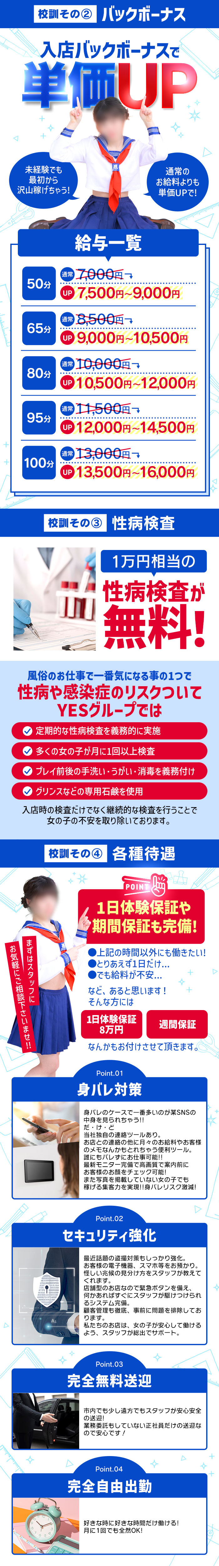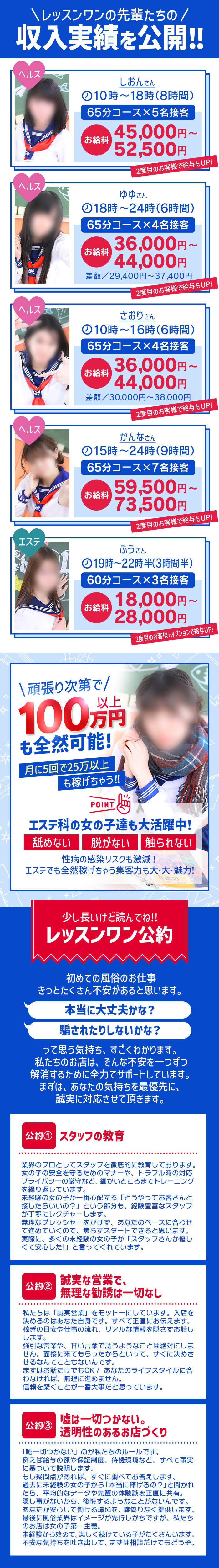 お給料がYESグループ松山で1番高いのを聞いて、そこに魅力を感じました! かといって特別なコースや身体のパーツを使う難しいプレイなどはないので、色々な面で考えてもレッスンワンの方がお得に稼げると思いますよ!