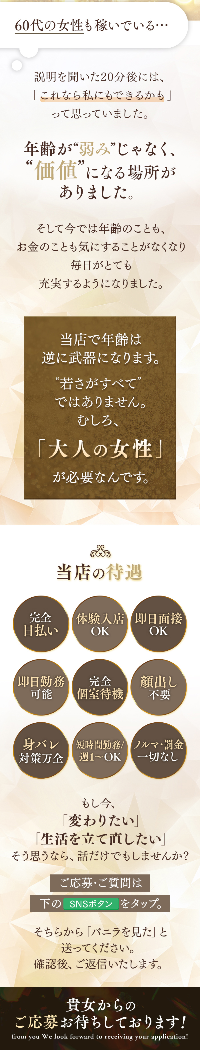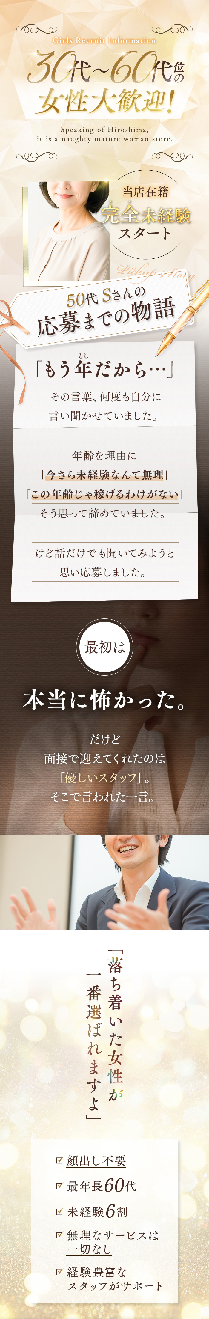 30代~60代が輝く熟女さん向けのお店!!今回は“斎藤”さんを取材しました。同店は30代~60代の熟女さんが多数活躍をするデリヘル店。ルックスやスタイル、年齢を採用では重視していません。スタッフさんも女性へ感謝の気持ちを忘れず日々サポートを行っています。出稼ぎの方も募集しており、生活に必要なものを揃えた寮も完備しています。