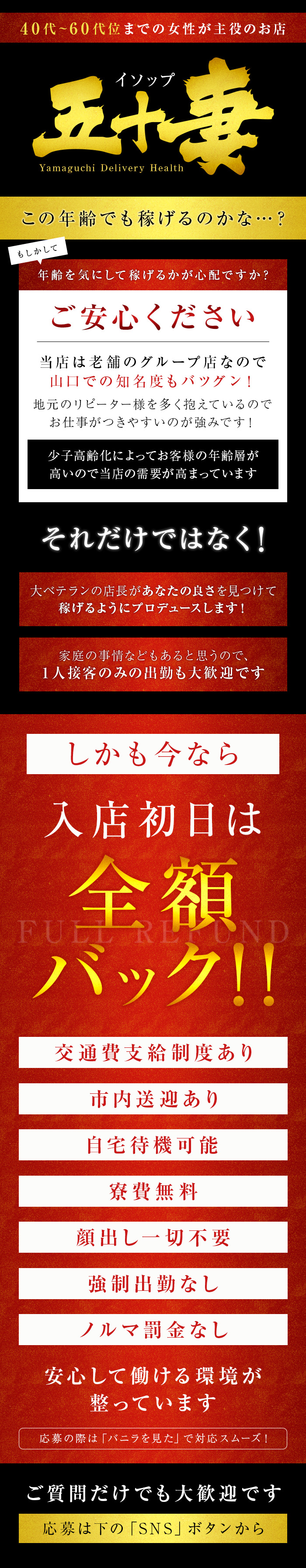 当店は熟女店となりますので、若ければいいと言う事もありません お客さんの年齢層も40代~が多くなり、主に求めるモノは癒し要素が大きくなっております。 もちろん、最低限の接客する格好はして頂きますが容姿が全てと言う世界ではありませんよ!