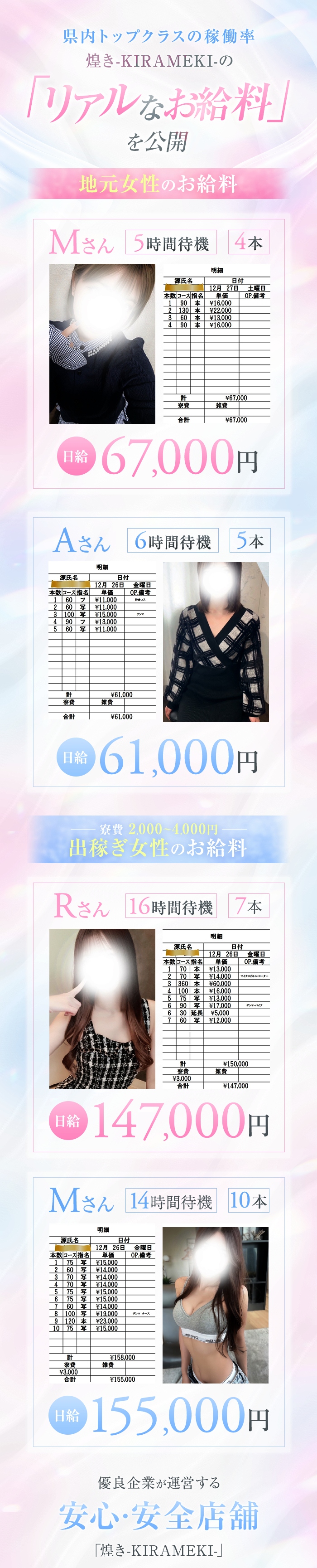 こんにちは~!スタッフ ひいです!画像の日以外にも7.8名10万円オーバー出る日結構あります!7.8万円の方も+4.5名はおります💦本題ですが先日未経験で入店してくれた18歳の女の子からご質問です「写メ日記ってどう書いたらいいですか?」なんでもいいんです!お客様は写真から雰囲気が知りたいし、ちゃんとお客様へ感謝の気持ちが表せているかな?フムフム...あげればきりがないほどネタはありますねでもまとめて1日に4本5本まとめてじゃないほうがいいかもしれないですお休みの日にもプライベートなことを上げたりするとかの方がいいですねアクセスの伸ばし方などはお気軽にスタッフまで♬ご質問だけでも構いません!ご応募お待ちしておりますm(__)mLINEID:kirameki-7