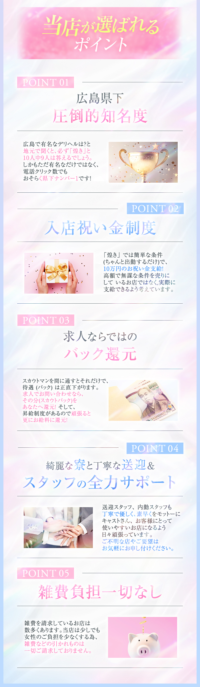 広島で有名なデリヘルと言えば10人中8.9人が【煌きグループ】と答える事と思います!当店は歴史だけの名ばかり有名店では無く、実際に稼げる『繁盛店』です!
