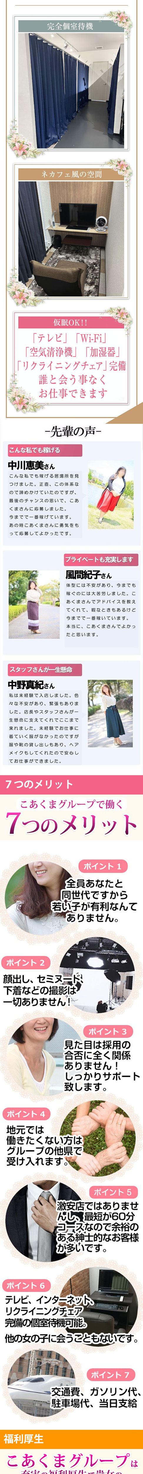 大手クループ 熟女日本最速 4年で全国30店舗 令和4年2月 岩国店・四日市・鈴鹿店オープン 16年以上の信頼実績がある『こあくまな人妻たち』の2号店『こあくまな熟女たち』 がオープンしました!! 広島で16年運営している【こあくまグループ】は稼ぎやすさはもちろん、働きやすい環境を整えています。 未経験の方はもちろん、経験者の方も大歓迎です。 20代・30代、40代の方を中心に募集してますのでお気軽にお問い合わせ下さい。 また70代まで応募受付中です!