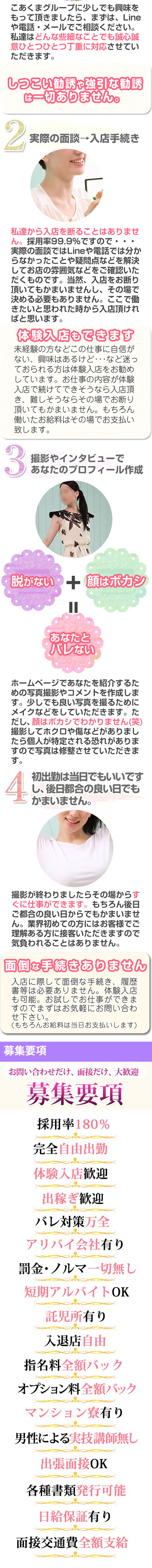 この業界で働くにあたり、誰もが気になる点だと思います。 だからこそ安心して働いて頂けるように、敢えてお顔出しはしておりません。 また、グループとして18年の営業実績の中で身バレに対するノウハウもしっかり有りたくさんの対策を取り揃えております!