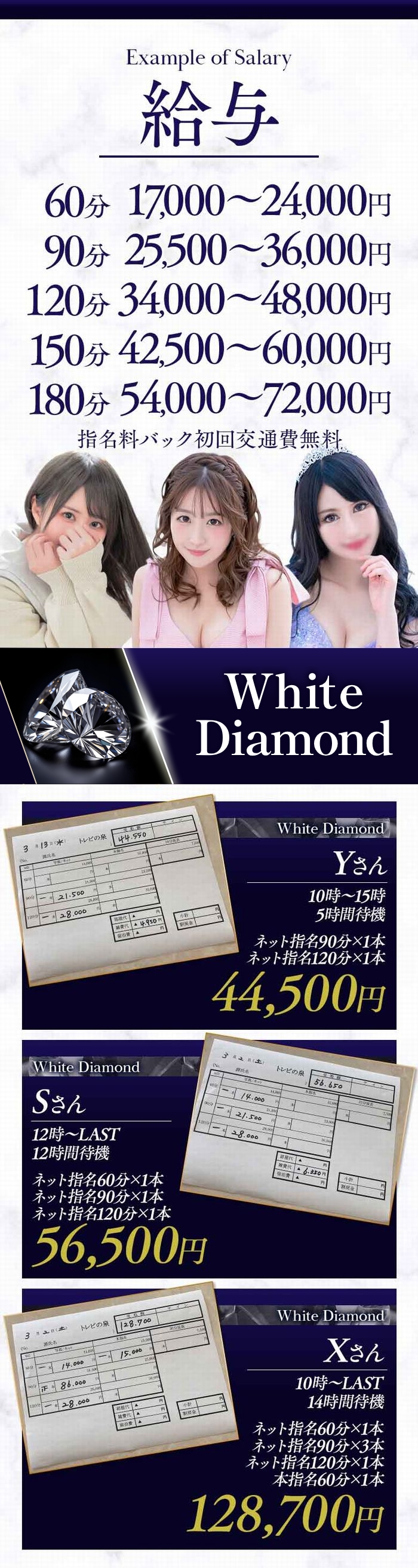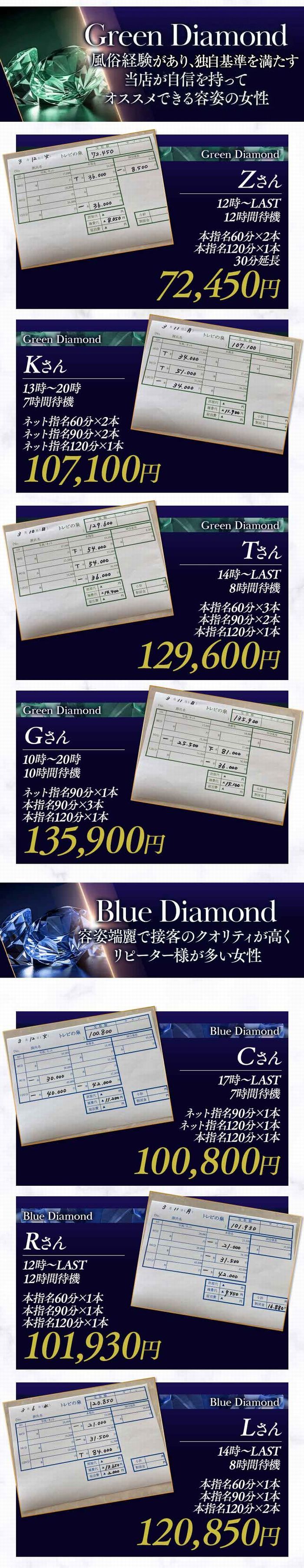 各コースバック料金 GREEN Diamondコース 60分 17000~24000円 90分 25500~36000円 120分 34000~48000円 150分 42500~60000円 180分 51000~72000円
