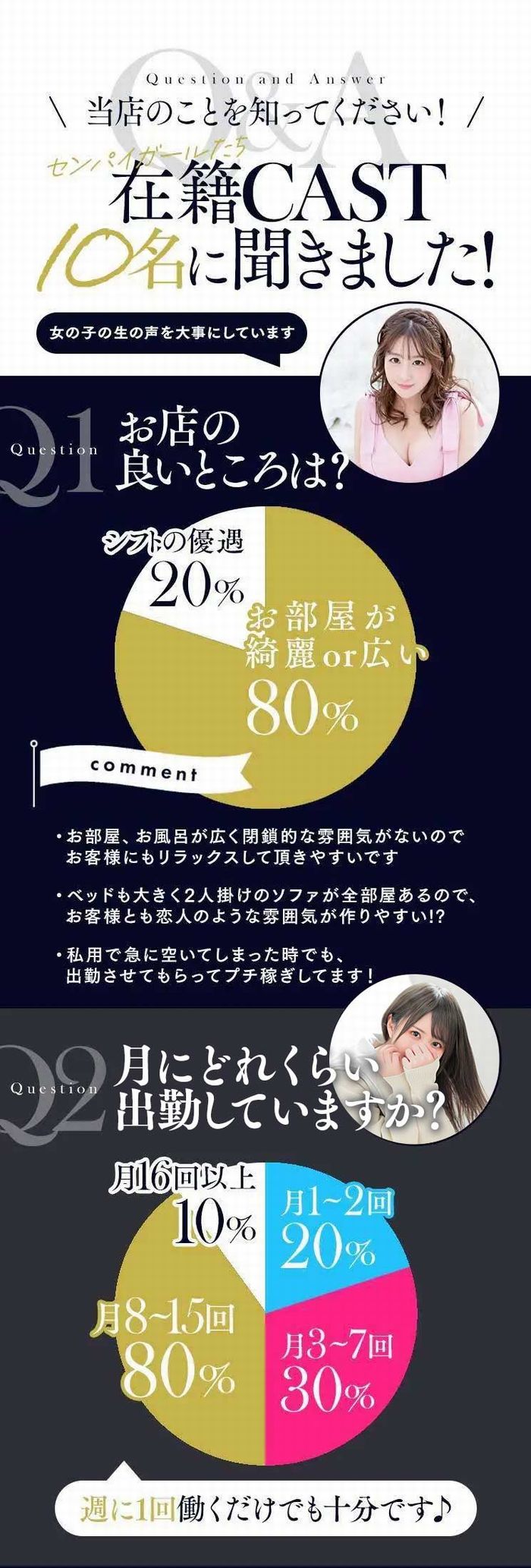 副業やWワークを歓迎しているお店だよ。時間が許す限りガンガン働いていお金を稼ぎたい女の子にはありがたいよね。シフトの入れ方にはお店ごとに決まりがあるから、詳しい条件は問い合わせてみよう♪