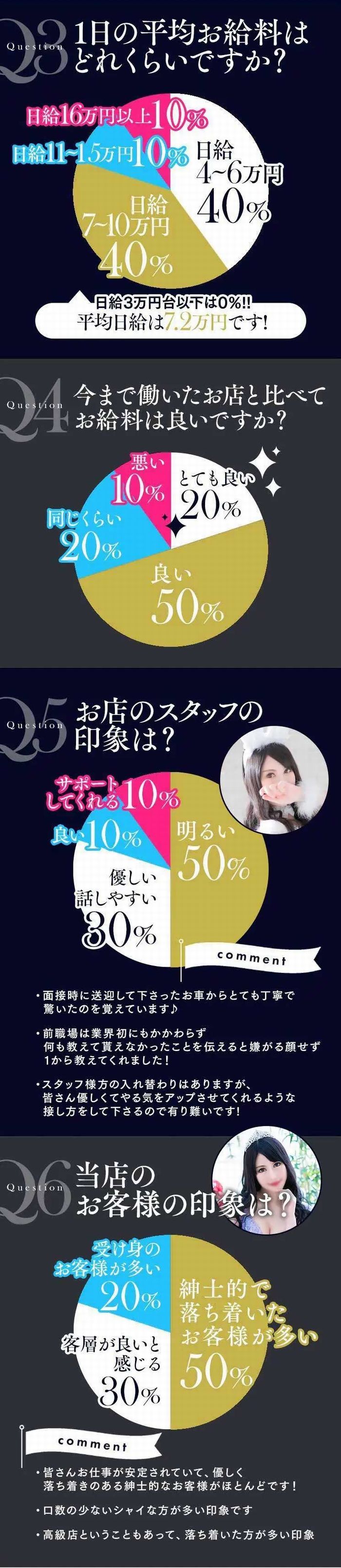 高級感のあるサービスをお客様に提供するお店だよ。女の子に求められる接客レベルが高くなる分、待遇も手厚くてしっかり稼げるからやりがいがあるよね。お店ごとに高級店ならではのルールもあるから、詳しい条件は問い合わせて聞いてみよう♪