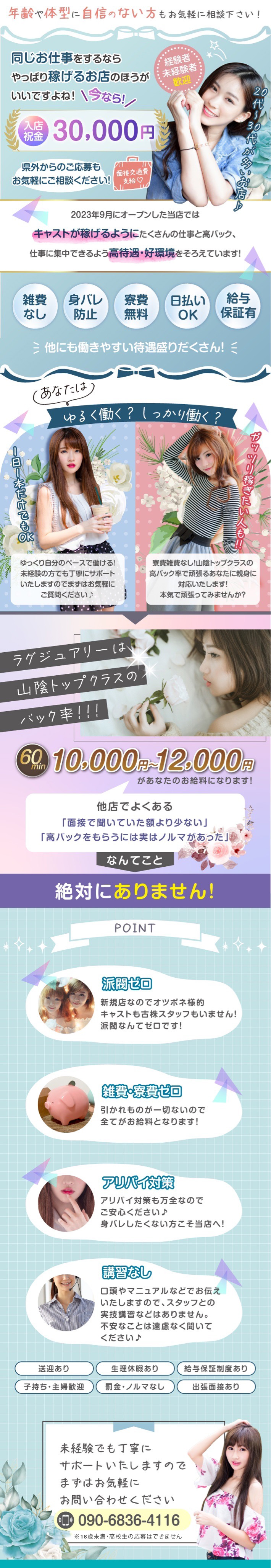 ・県外からのご応募もお気軽にご相談ください! ・雑費がないからしっかり稼げます ・お店のイベント時に女性の負担はありません! ・アリバイ対策万全です!身バレしたくない方こそ当店へ! ・講習等は一切ありません。初めての方でも口頭で説明いたします! ・頑張る方には親身に対応! ・年齢や体型に自信のない方もお気軽に相談下さい! |