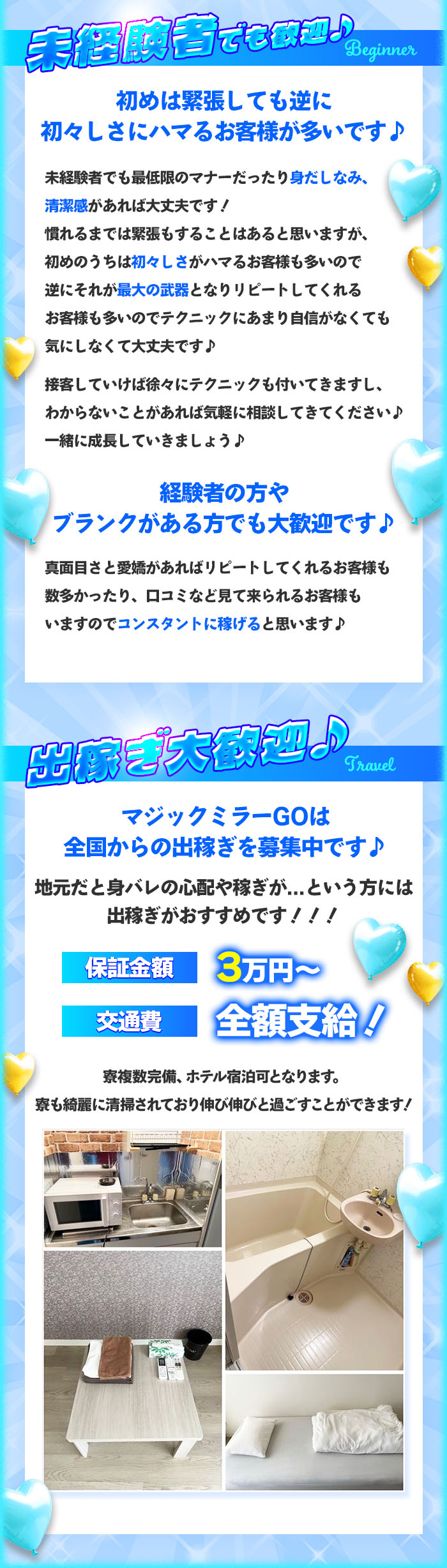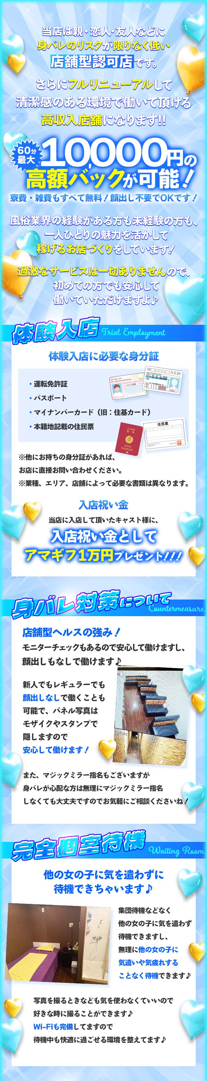 当店は未経験の方は50%ぐらいいらっしゃいます! 業界初めての方でも店舗型になるので何かあっても スタッフがすぐ駆けつけれますので安心して働けます♪