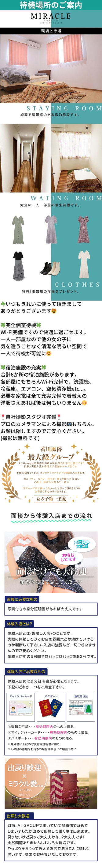 【当店が選ばれるワケ】 ①まず最初に、メンズエステMIUはマッサージメインのソフトサービス店になります。 舐めない・脱がない・触られない・舐められないのスローガンのもと、 風俗店にもかかわらずソフトサービスのみのメンズエステ店になります。 風俗初心者並びに触られたくない方や脱ぎたくない方もいると思います。 そんな方にはもってこいのお店になるのではないでしょうか。お話を聞くだけでも大丈夫です... 【ソフトサービスなのに稼げる】これ本当です。 ②顔を出さなくても稼げるお店です。 当店は他店のようにネットや雑誌広告に顔を出したりしなくて大丈夫です。 写真に抵抗がある女の子は写真NGでもかまいません。地元の女の子は特に必見です。 知人・親バレ無し!未経験の方や、このお仕事がバレたくない女の子は当店がオススメです! 宣伝広告費もかなりの金額を投資しておりますので女の子さえいれば電話もなります。 ③個室待機、自宅待機OK 人間関係の悩み無し! 当店では待機場所を、完全個室(Wi-Fi完備)で多数用意していますので 他の女の子と顔を合わせる必要がありません。 待機中は一人でゆっくりくつろいでください。 Wi-Fi完備なので通信費も気になりませんよ~。もちろん、禁煙と喫煙で分けていますので快適です。