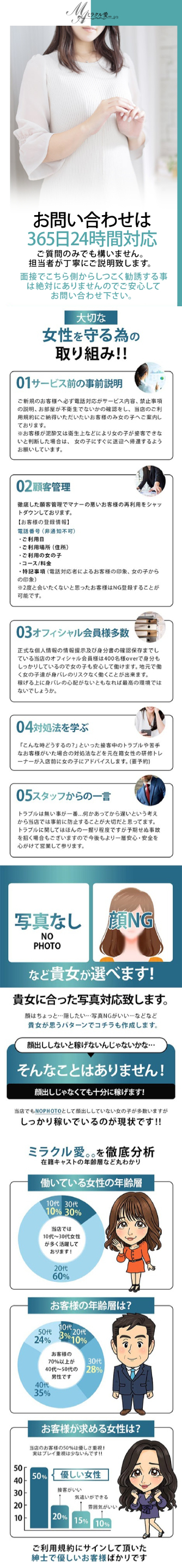 当店なら誰にもバレずにお仕事が出来ます。パネル写真の掲載、撮影無し、万が一の場合のアリバイ会社や書類の作成なども対応し、初めてこういったお店で働く女の子全員が安心して在籍できるように徹底しています。お客様からのご予約は電話でお受けしておりますが、携帯番号での顧客管理も行っておりますので知人やご家族など接客NGの登録を事前にすることが可能です。