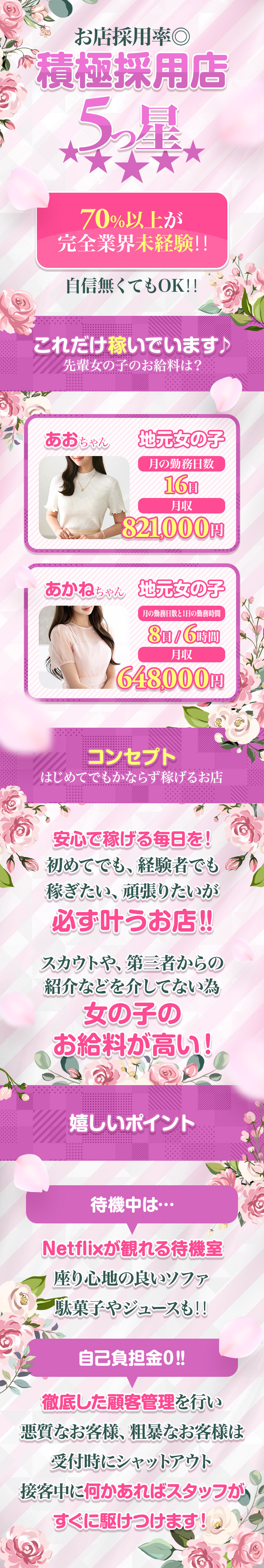 大手グループが経営しているお店だよ。待遇や条件も手厚くて安心だし、集客力もあって女の子が稼ぎやすい!待遇や条件はグループの中でも店舗ごとに変わってくるから、気になるポイントは問い合わせて聞いてみよう♪