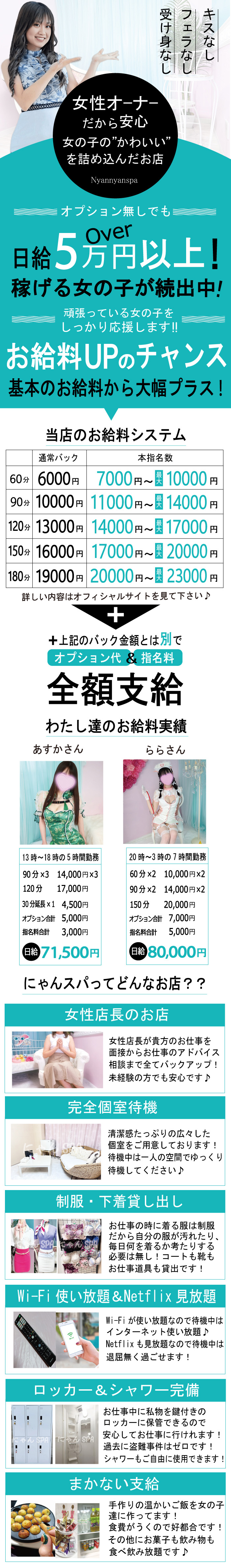 - 入店祝い金にプラス最低5日間出勤するだけで最大31,000円支給致します!にゃんスパに応募してくれた方全員が対象になります!