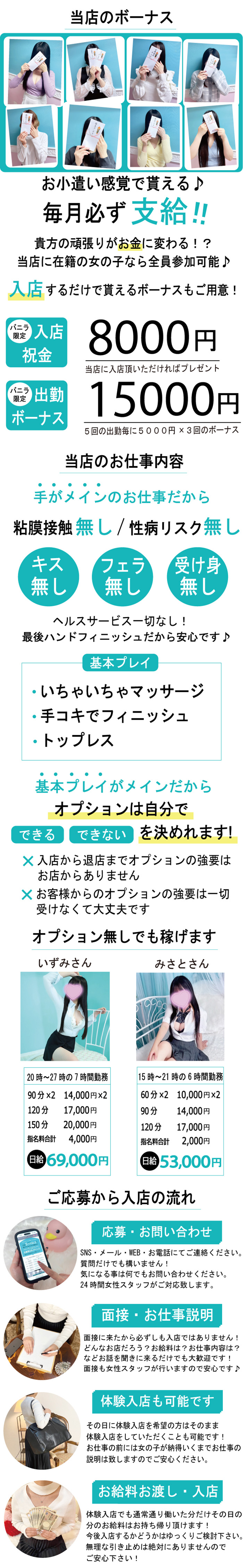 手を使うだけ・見ているだけ・または女の子が受け身にならなくてOKなソフトサービスメインのお店だよ♪初心者の女の子には始めやすいお仕事だね!コースによってサービスの違いがあるお店もあるみたいだから、お仕事内容は事前に聞いてみよう!