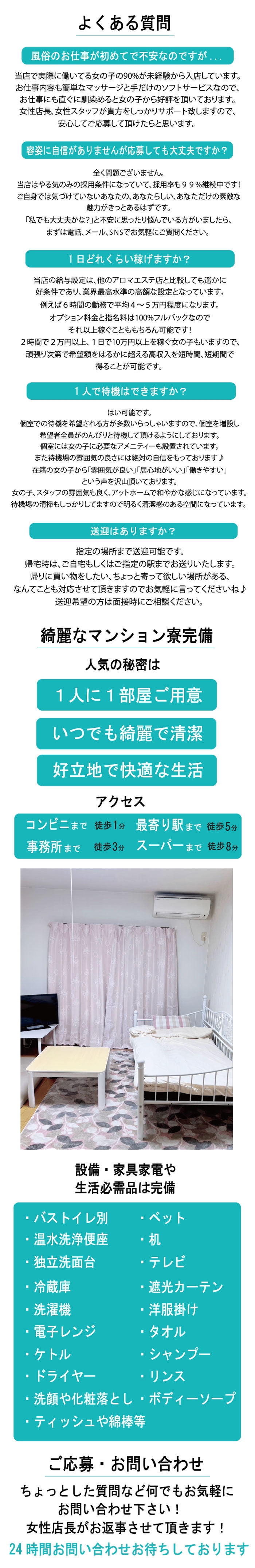 | 交 通 | 送迎場所相談可能 女性店長・女性スタッフがお迎えに行きます 出勤・退勤・面接時送迎可能です。 出張面接も可能です。 マイカー通勤可能・駐車場あり。 お気軽にご相談ください。 |