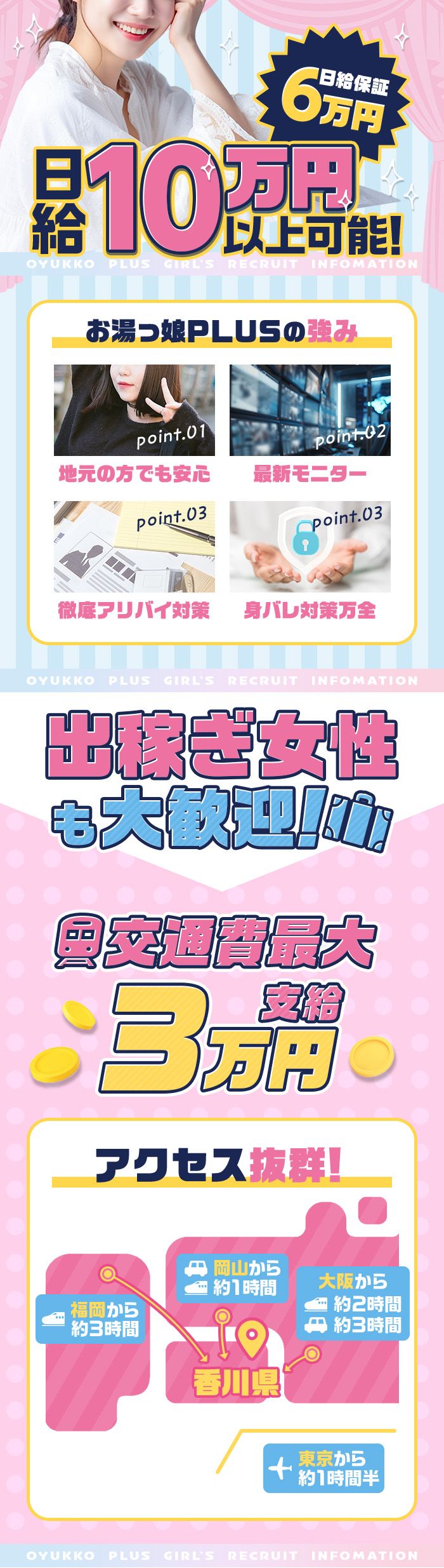 当店は四国の同業他店様の中では料金設定が安価な為、高回転、高稼働が可能です。業界未経験の方も大歓迎♪出稼ぎ・在籍で検討いただけます!ブランクがある、短期、Wワークのかたでも大歓迎です!!!はじめてのお仕事を当店で始めてみませんか?また、当店では貴女に稼いで頂ける最高の環境をご用意しております!★全額を当日精算★完全自由シフト出勤★個室待機(Wi-Fi完備)★罰金、ノルマ、セクハラ講習など一切ナシ!ただもちろん、初めて(久しぶり)のお仕事・環境では色んな不安が拭えないのは当然の事だと思います。当店では少しでも安心してお仕事を始めて頂けるように【体験入店保証】を御用意しております!保証金額は、勤務スタイルに合わせて変動することが可能ですのでお気軽にお尋ねください貴女からのご応募、心よりお待ちしております✨