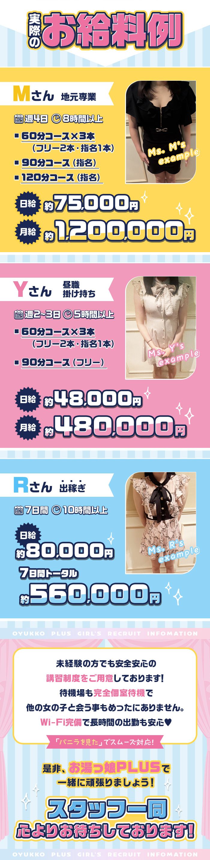 お給料は全額当日精算。 罰金など一切無し、セクハラ講習無し 交通費支給(規定アリ)最低保証制度(規定アリ) 宿泊手当アリ、託児所の紹介、最新の身バレ対策 |