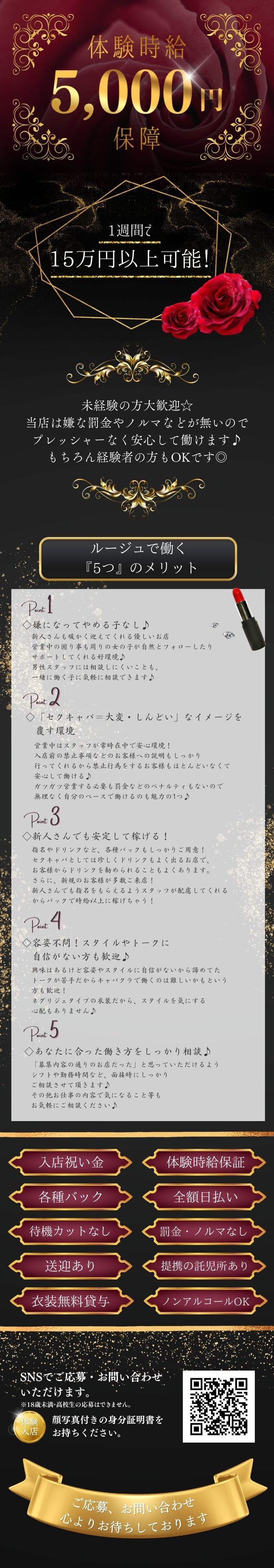 *入店祝い金30,000円(条件あり) *体験時給保証 *各種バック(ドリンク・指名など) *全額日払い *待機カットなし *罰金・ノルマなし *送迎あり *提携の託児所あり *衣装(ランジェリー)は無料貸与 *ノンアルコールOK |