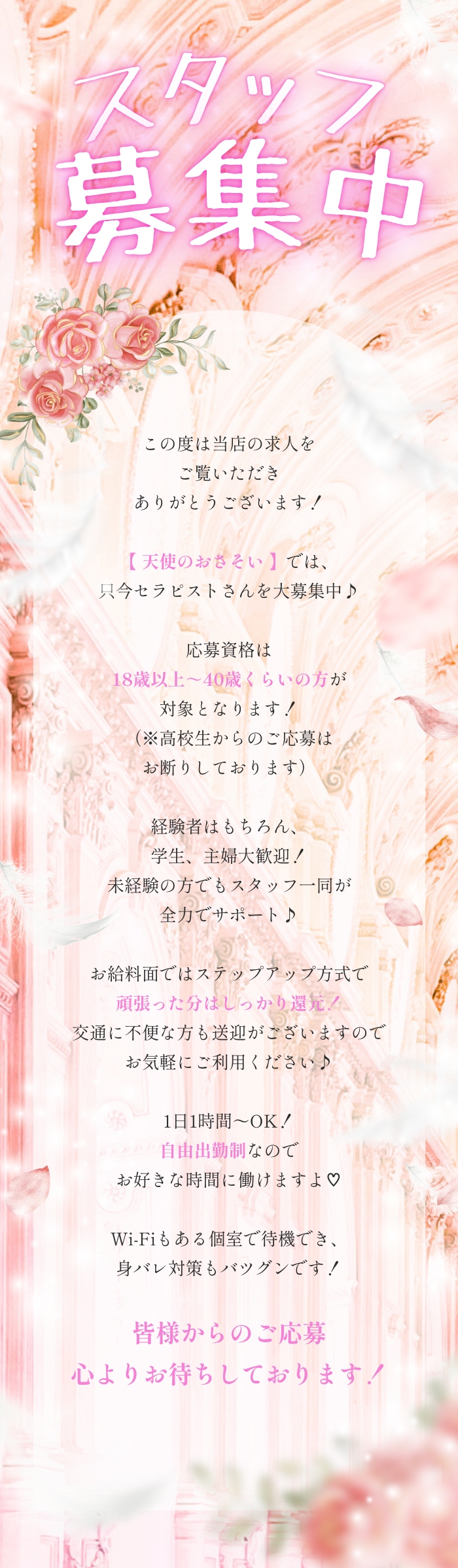 こんばんは🌃求人ブログ担当の東郷です❤︎最近寒いですね😖❄️この時期は体調崩しやすいので、無理せずあたたかくして過ごしてくださいね😣✨1人でも多くのお客様の目に【天使のおさそい】を知って頂くためにSNS運用にも力を入れています✊🏻🎀InstagramやThreadsを中心にお店の雰囲気やセラピストさんの魅力がしっかり伝わるよう日々発信中📱❤︎その結果、「SNSを見て来ました!」とご来店してくださるお客様もとても多いんです!🙌🏻お店の存在を知ってもらえる機会が増えることで、セラピストさんにとっても【集客しやすい環境】が整っています✨「出勤してもお客様が来るか不安⋯」そんな心配が少ないのもSNSに力を入れてる当店ならでは🪽これからもお客様の目にとどまり、「行ってみたい」と思ってもらえる発信を続けていきます☺️🤍安心して働きたい方!集客面がしっかりしたお店を探している方は是非【天使のおさそい】をチェックしてみてください!👀❤︎ご応募お待ちしております!(❀ᴗ͈ˬᴗ͈)"