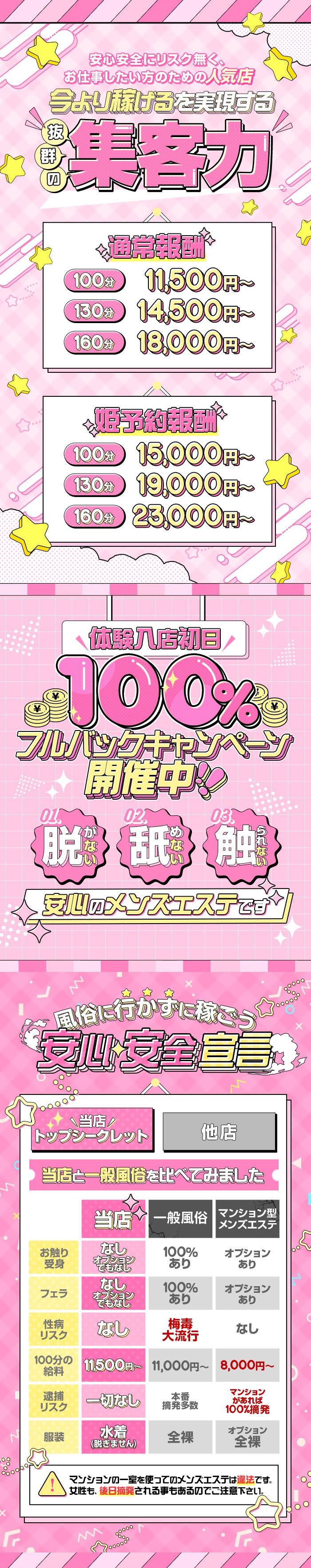 - 体験入店にお越しのセラピストさん全員が対象です。体験日当日は何本付いても全てフルバックお給料にてお仕事可能です♪1日で15万円超えも可能!お気軽にお越しくださいませ☆