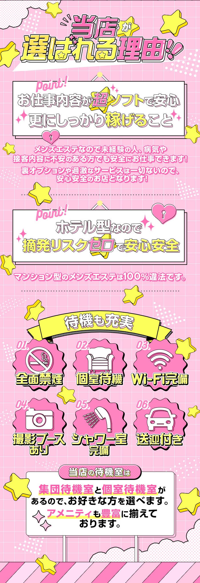 大手グループが経営しているお店だよ。待遇や条件も手厚くて安心だし、集客力もあって女の子が稼ぎやすい!待遇や条件はグループの中でも店舗ごとに変わってくるから、気になるポイントは問い合わせて聞いてみよう♪