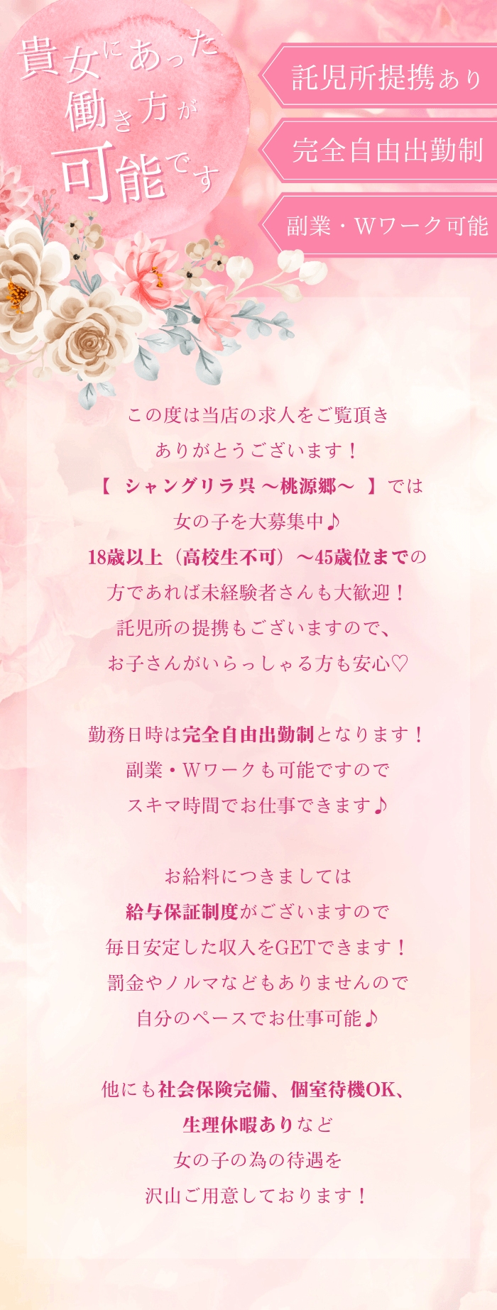 子持ちのママさんでも安心して働けるように、託児所を紹介できるお店だよ!最近はお店が提携してくれている託児所も多いんだって!お店によっては託児所の費用を一部負担してくれるみたいだから、必要な時は詳しく聞いてみてね☆