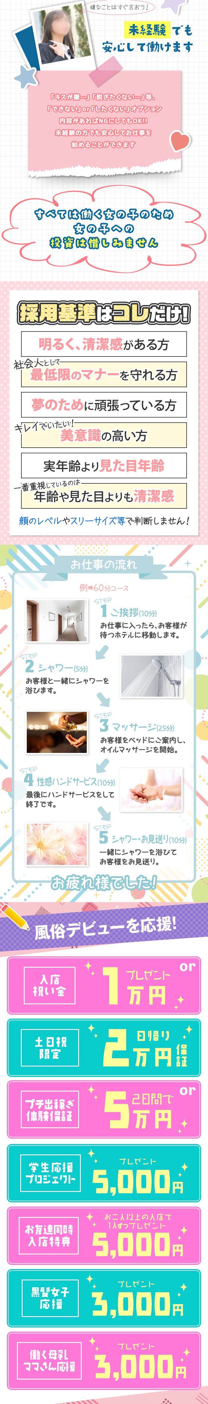 ルックスやスタイルが整っているに越したことはありません。ですがルックスやスタイルそれだけで採用を決めているわけではありません。特に当店では性格・雰囲気・愛嬌・清潔感・やる気や目標など。女の子の中身の素晴らしさも重視して採用をしております。ご自身では気づけていない!あなたの、あなたらしい、あなただけの素敵な魅力がきっとあるはずですよ。ただし18歳未満の方及び高校生の採用はできませんので、予めご了承下さい。「私でも大丈夫かな?」と不安に思ったり、悩んでいる方がいましたら、まずは、電話・メール・LINEで気軽にご質問ください。