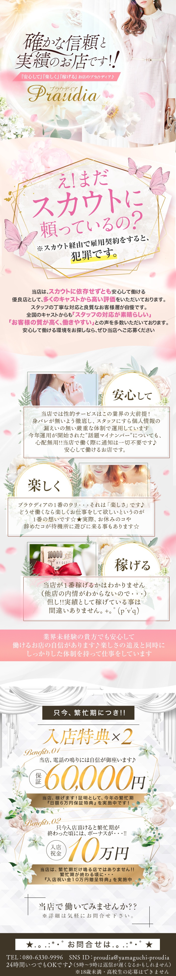 PROUDIACASTSUPPORTPOLICY💎頑張りが、きちんと報われる場所へ💎プラウディアでは、頑張るあなたを「報酬面」でも全力でバックアップしています。例えば、毎週月曜日に実施している「マン〇デー」20分延長サービス。「サービスだから給料はそのまま」――そんなことは、プラウディアでは一切ありません。延長した分の報酬は、もちろんきちんと上乗せしています。✨この「20分」を、未来につなげてください✨追加の20分を活用して、・お客様に口コミを書いていただく・マイガール登録をしていただくなど、「次」に繋がる行動をぜひ意識してみてください。こうした一つひとつの地道な積み重ねが、実際に当店の実績として表れています。プラウディアのリピート率は、目に見えて上昇中。あなたのちょっとした心配りが、確かな収入と安定した指名へと、きちんと繋がる仕組みを整えています。🛡安心して働ける環境を、約束しますもちろん、不安なことがあればいつでも相談してください。優秀な受付スタッフと送迎スタッフが、24時間体制であなたを全力サポートします。トラブルから守ること、働く環境を守り抜くこと――それが、私たち運営の責任です。周南市で、「ここが自分の居場所だ」と思えるお店になれるよう、プラウディアは全力を尽くします。一緒に、リピーター様に愛される“長く続く、素敵なお店”を作っていきましょう。