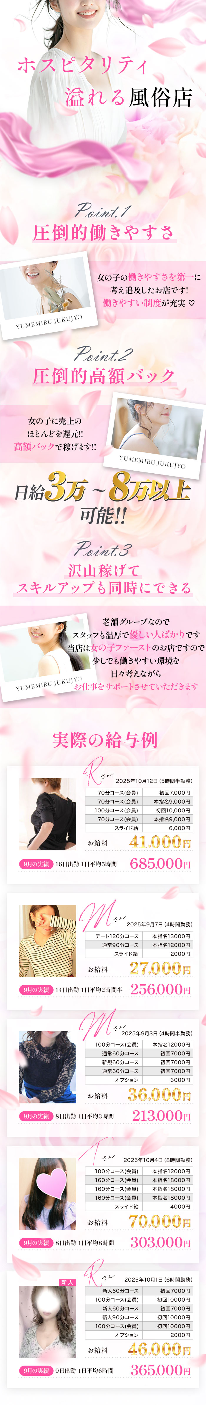 お給料(初回指名) 60分7000円 90分9000円 120分12000円 本指名の場合は上記に+2000円 月の本指名数20本以上で翌月のお給料全コース+1000円 規定アクセス数クリアで月のお給料全コース+500円 雑費消費税 8%